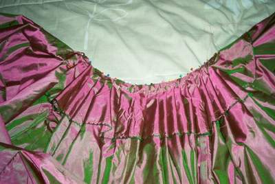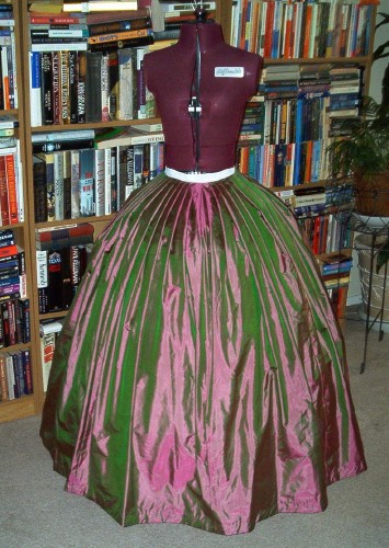The pleating pinned, both right and wrong sides. This pleating attempt was quite successful, unlike my 1863 dress pleating (which ended up being gauged!) thanks to the wonderful directions Anna posted on the Sense and Sensiblity message board! The front is pleated, the center back is gauged, based on a skirt in Period Costume for Stage and Screen. I thought it would be a little easier to fit this way. Pretty also, since I love the look of gauging.